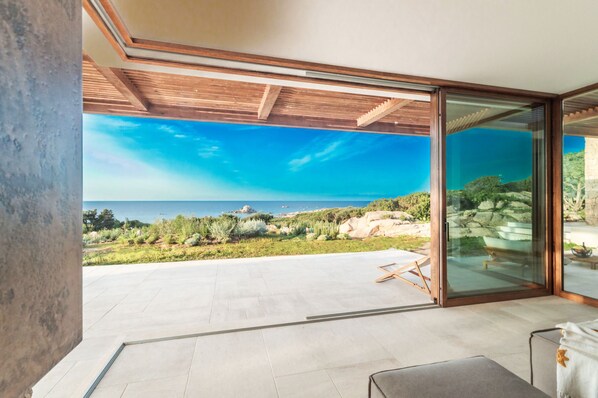 The house, the result of a bold and sophisticated architectural project, stands in a dominant position, with northwest exposure and a 180-degree sea view, offering breathtaking sunsets and a panorama stretching from Asinara to the white cliffs of Bonifacio.
