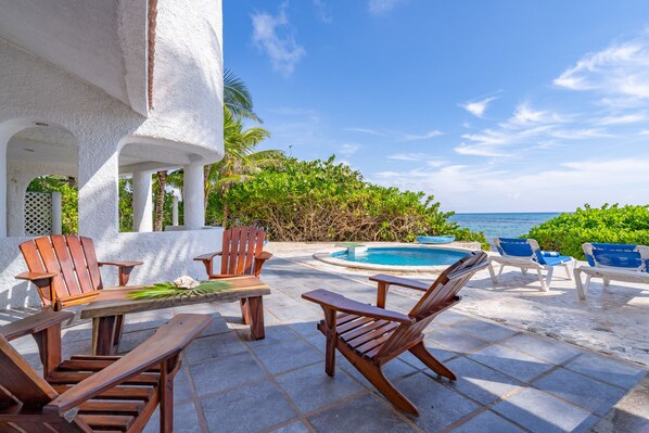 De patio komt uit op de oceaan en biedt toegang tot snorkelen tot de Half Moon-baai. Het prachtige kleine ronde zwembad zit in een groot houten terras waar het panoramische uitzicht u uitnodigt om te ontspannen met de drank van uw voorkeur in verstelbare stoelen.