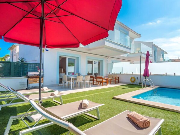 Port d'alcúdia: Zeer moderne, mooi huis "Teresa Beach 1", van 2 verdiepingen, eenzijdig aangebouwd, bouwjaar 2017. In de plaats, rustige, zonnige ligging, 900 m van de bosrand, 100 m van zee, 3 m van het meer, 120 m van het strand, 1 m direct aan het kanaal, directe toegang tot de lagune. Voor alleengebruik: mooie tuin met gazon en planten, openluchtzwembad hoekig (6 x 4 m, seizoensgebonden beschikbaarheid: 01.Jan. - 31.Dec.). Buitendouche, patio, prieel, tuinmeubelen. In het huis: Internet (WiFi), centrale verwarming, air-conditioning, alarmsysteem, wasmachine, droger. Winkel, levensmiddelenwinkel, supermarkt, restaurant, bar 300 m, centrum te voet bereikbaar in 15 minuten, bushalte 200 m, zandstrand 120 m, rotsstrand 3 km, meer (zwemmen) 3 m. Jachthaven 4.5 km, jachthaven 4.5 km, golfterrein (18 holes) 7 km, tennis 1 km, manege 2 km. Geschikt voor families, geschikt voor senioren. Het objekt is geschikt voor 6 volwassenen groepen jongeren uitsluitend op aanvraag. Vliegveld 50 km van het huis. In dit complex zijn verder 4 huizen te huur.