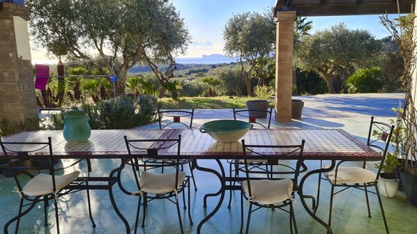 The house is nice and features a terrace with a great view. It is suitable for 6-8 people. We were 8, but one of the rooms is not renovated. The garden is large, and the house is well-equipped with everything you need for a comfortable stay, including facilities for cooking and washing. It is located about 10 minutes by car from the city center. After 7 days, the energy cost amounted to 47 euros, but we weren't at the house much during the day.