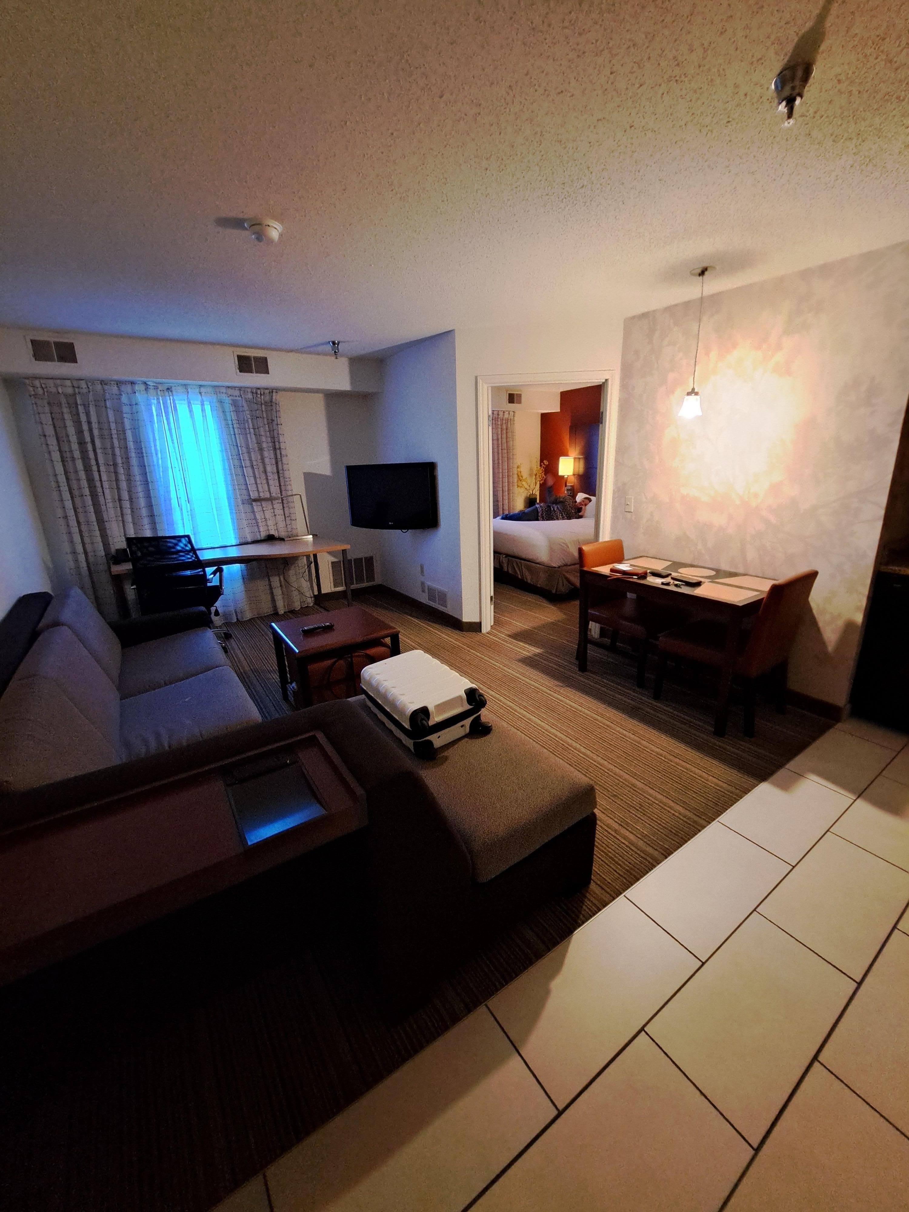 Very spacious suite! So nice for the two of us and our dog at the end of a long day of driving. While it was a little dated and carpet showed signs of wear, the bed was comfy; shower had great pressure; the place was quiet; staff was friendly. We would surely stay here again!