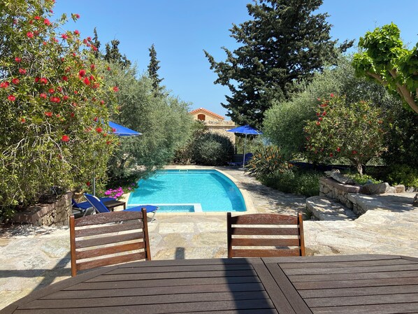 The house is surrounded by a beautiful garden. The terrace is just above the pool in front of the house. Next to the house there is a bricked barbecue. The pool is 4m*8m. In the cooler months it can be heated with a pool heater (pool heating on request, € 15.00 per 24 hours).
