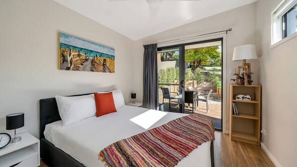 Out on the balcony, guests can enjoy the BBQ, positioned for fresh air cooking with bush surrounds. The bedroom opens onto a wooden patio with peaceful outdoor seating, a quiet spot for a slow morning tea or an afternoon read. Off street parking for one car is also available.