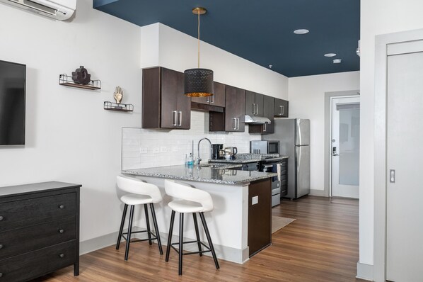 Een volledige keuken met full-sized oven en fornuis, koelkast en vaatwasser