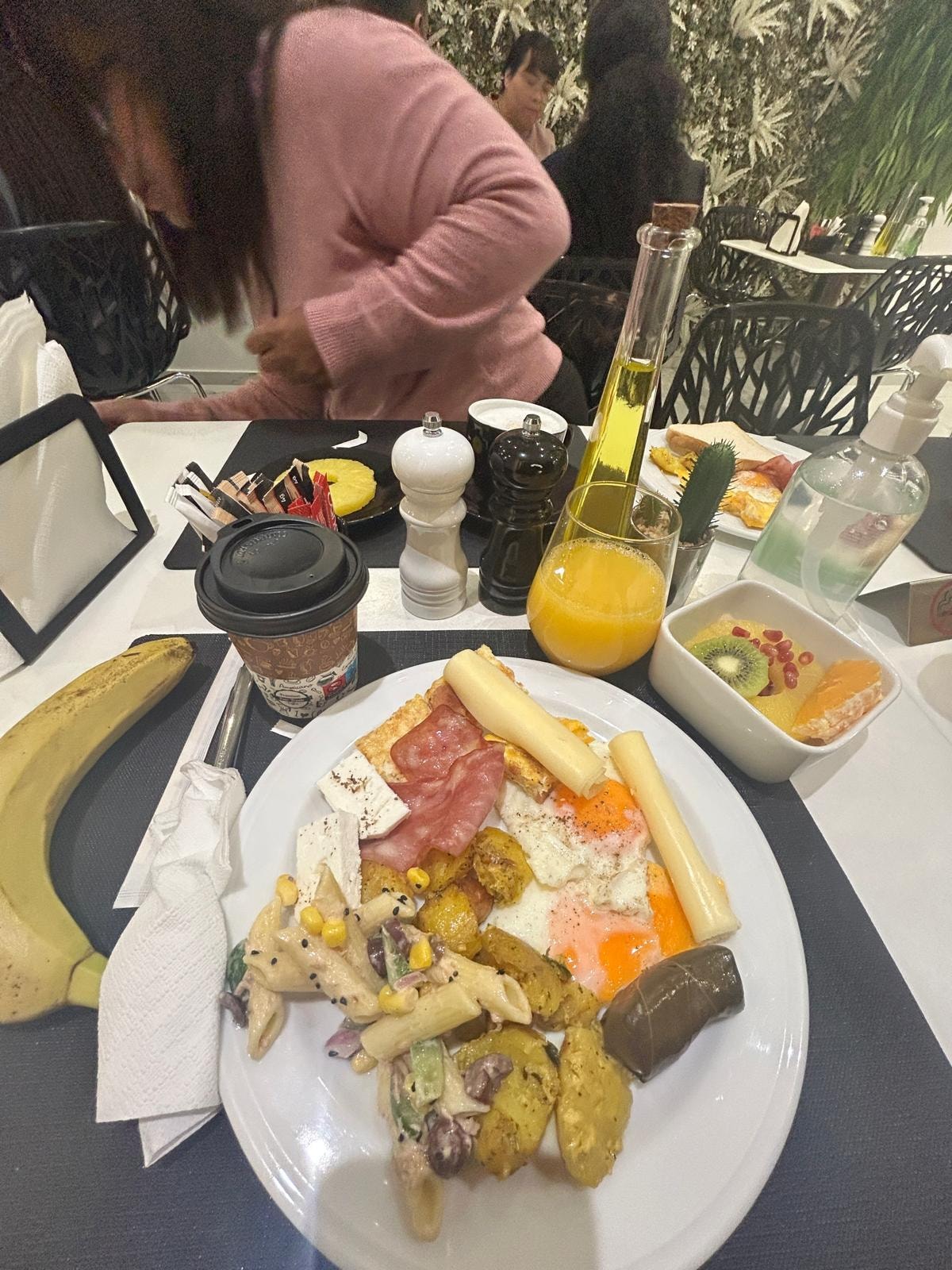 The breakfast is really a brunch excellent, eggs, rice, pasta, pastries, chesse , ham , you named. Just wonderful.