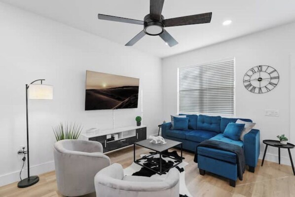 The living room is the heartbeat of the open-concept design area, offering a unique and upbeat setting to relax between exciting Austin adventures.