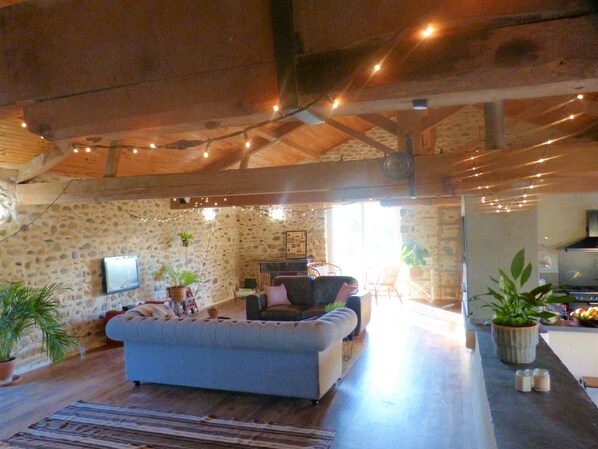 Maison de la Rivière Grange is een prachtig verbouwde schuur in de idyllische omgeving van de regio Bearn des Gaves, aan de rivier de Saison, op slechts 5 minuten rijden van het middeleeuwse dorp Sauvetere de Bearn. Het pand is volledig gerenoveerd en bestaat uit vier tweepersoonskamers en 3 badkamers met inloopdouches en een bad. De grote slaapkamer heeft een eigen badkamer. Een van de slaapkamers is een familiekamer met een dubbele matras voor kinderen in de vooravond. Het kan tot 10 personen sijpelen. Het heeft een grote woonkamer en een open keuken / eetkamer met plaats voor 10 personen, evenals een ruim terras met ligstoelen, met uitzicht op de rivier de Saison. We hebben vloerverwarming, evenals een Zweedse houtkachel. We zijn omringd door 10 hectare grond (allemaal onderdeel van het pand) en we hebben onze eigen toegang tot de rivier om te zwemmen of vissen. Naast onze kippen waarvan u tijdens uw verblijf kunt genieten van eieren, vindt u hier ook vijf miniatuurgeiten, een paard en twee pony's, een kat en een bearnaise berghondkruis. Houd er rekening mee dat de trap geen leuning heeft, wees extra voorzichtig en houd altijd toezicht op de kinderen.