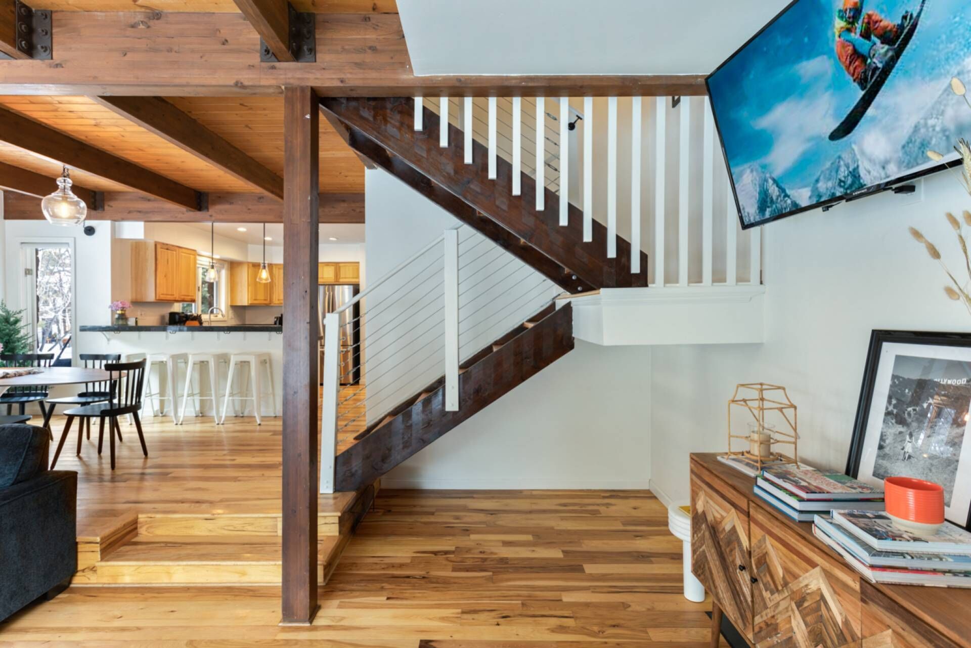 Deze prachtige woning, die comfortabel geschikt is voor maximaal 10 gasten, is verdeeld in twee niveaus. Het lagere niveau omvat een moderne, volledig uitgeruste keuken met granieten aanrecht, gewelfde plafonds, een open haard, wasruimte, skiruimte en parkeerplaats.
