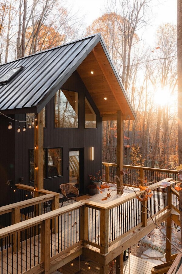 Firefly Cabin is a luxury couples retreat on 7 private acres. With huge windows in every direction, you’ll feel immersed in the woods. Stargaze around the fire at the base of a giant rock outcropping. Relax in the hot tub or swing bed on the lower porch.