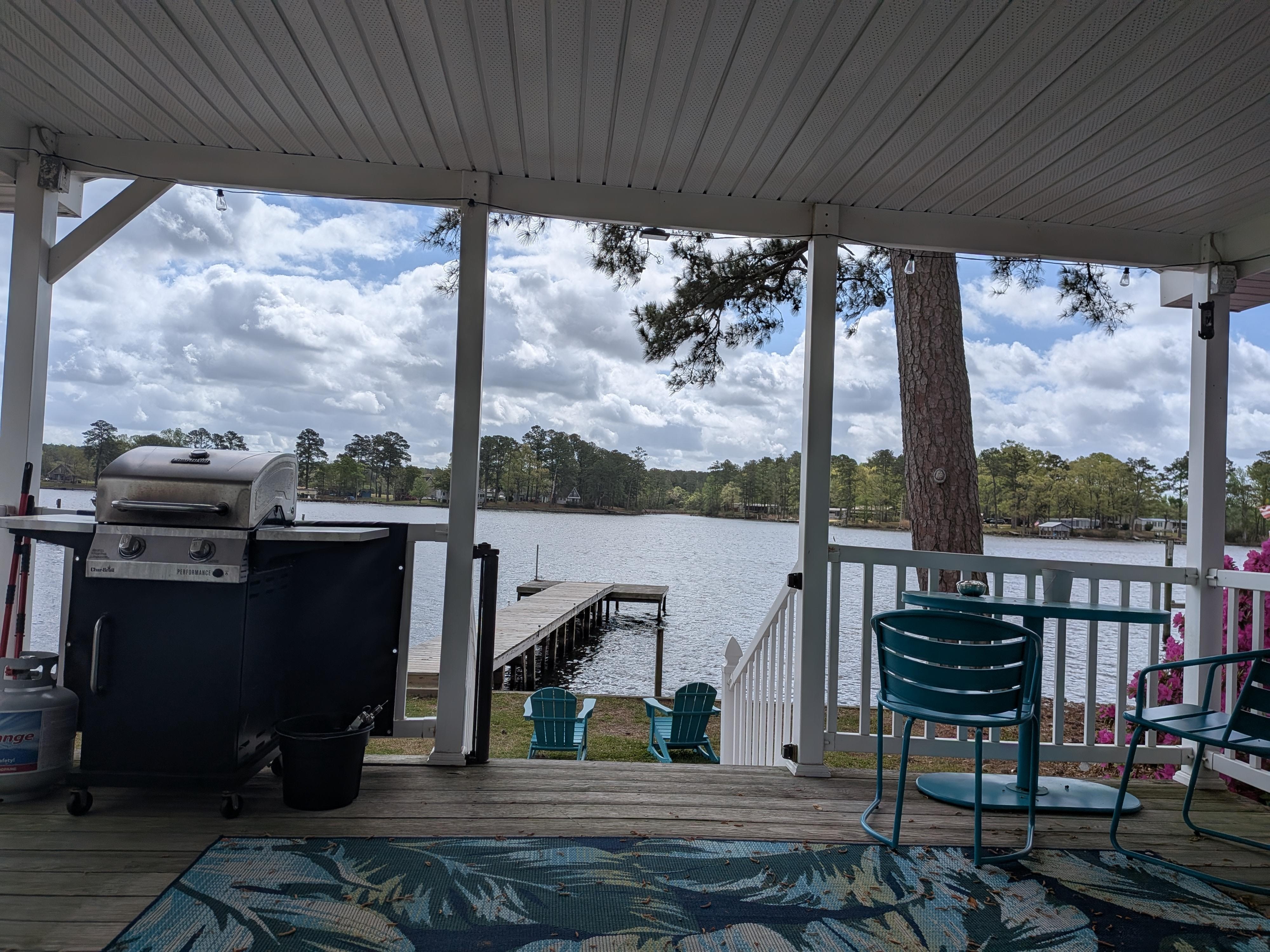 Our peaceful porch is perfect for a cookout, napping on our lounge for two with mosquito netting or just watching the fish jump.