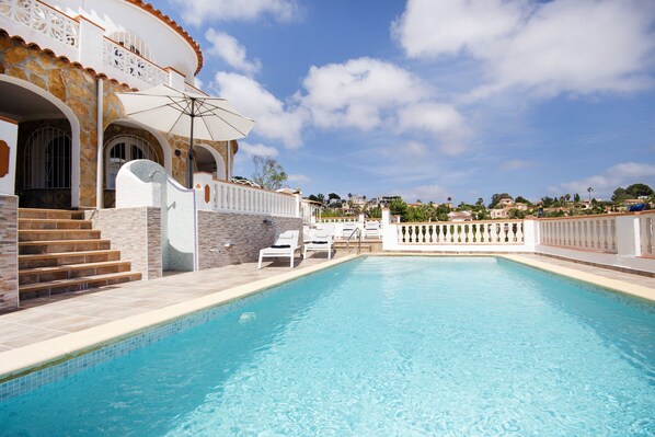Prachtige en gezellige villa in Benissa, aan de Costa Blanca, Spanje met privé zwembad voor 4 personen. De villa ligt in een heuvelachtige en residentiële kustomgeving, op 2 km van het strand van Cala Baladrar en op 5 km van Moraira. De villa heeft 2 slaapkamers en 2 badkamers. De accommodatie biedt een mooie tuin met gravel en bomen, een mooi zwembad en mooi uitzicht op de zee en de bergen. De bovenverdieping appartement is prive en het zal blijven vergrendeld en leeg tijdens uw verblijf.