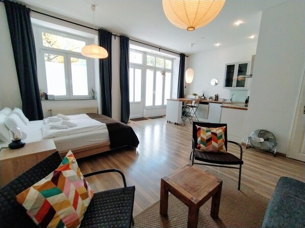 The main living area has comfortable queen size bed (160x200), a stylish couch that can be converted into a double bed (184x196), and a wardrobe.