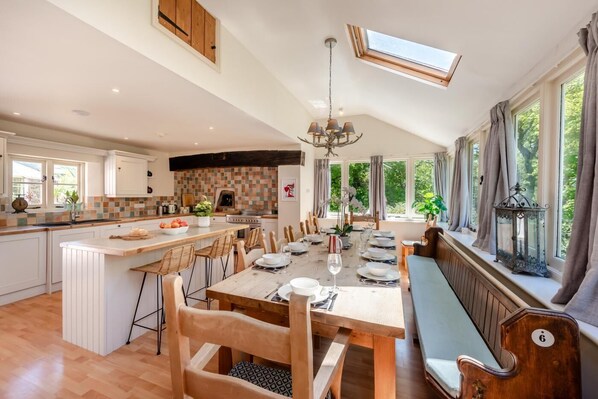 Step through the entrance hall to the inviting lounge with Smart TV exposed beams, stonework, original wood floors and a cosy wood burner. The impressive farmhouse-style kitchen area has a kitchen island, a charming dining table, skylights and a wall of windows. Out on the patio, fire up the BBQ and indulge in a fun, al fresco feast. Take a dip in the outdoor hot tub, or head to the family room to relax by the ornamental inglenook open fire while the kids enjoy a game of table football. Upstairs, you’ll find four elegantly styled bedrooms – a super-king-size (can be converted into twins) and a king-size – both boasting their own en-suite shower rooms. There’s also a bunk room and a twin bedroom that share a smart family bathroom. Just off to the side of the main cottage, you’ll find a charming single-level studio cottage with twin beds, a vaulted ceiling, garden views, a kitchenette and an en-suite wet room. Enjoy the private enclosed lawn and woodland garden, which has a shallow stream (please supervise young children and pets). Parking is available for four cars.