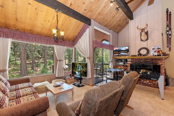 Een volledig natuurstenen houtgestookte open haard houdt u lekker warm terwijl u ontspant en geniet van de tafelvoetbaltafel of de mini-airhockeytafel. De gezellige woonkamer is uitgerust met een queensize slaapbank en twee comfortabele relaxfauteuils om op een flatscreen tv te kijken met een Blu-rayspeler.