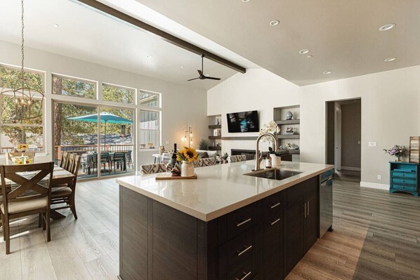 Step inside to an open-concept living space with vaulted ceilings and custom-modern finishes. The living room centers around a `Heat & Glo` smart fireplace - perfect for curling up after a day on the slopes or trails. The adjoining dining area and chef’s kitchen make it easy to gather together. Cook a meal with high-end DACOR appliances, brew a fresh pot of coffee in the morning, or prepare a family-style dinner around the spacious dining table.