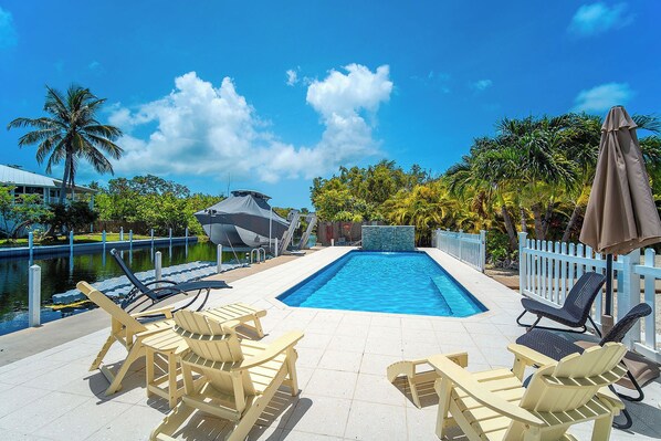Outdoor living? The fully fenced and manicured estate includes an intimate lighted Tiki hut, a large beautiful pool, and hot tub. In addition to a screened waterfront porch, the property also has an adjoining deck with an extra-large Weber propane BBQ grill for cooking and grilling your fresh catch of the day.