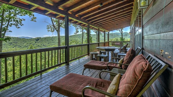 Deze ruime hut ligt op de top van een heuvelrug en kijkt uit over Blue Ridge aan de westkant. U zult natuurlijk naar buiten worden getrokken door de ruime omhullende dekken die het hele jaar door ongelooflijke uitzichten bieden. Neem plaats in een zweefvliegtuig, rocker of ligstoel voor stoelen op de eerste rij voor prachtige zonsopgangen en zonsondergangen over de bergen.