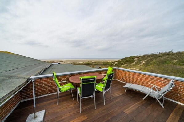 Het vakantieappartement beschikt over een gedeeld open terras met uitzicht op het duinlandschap en de zee.