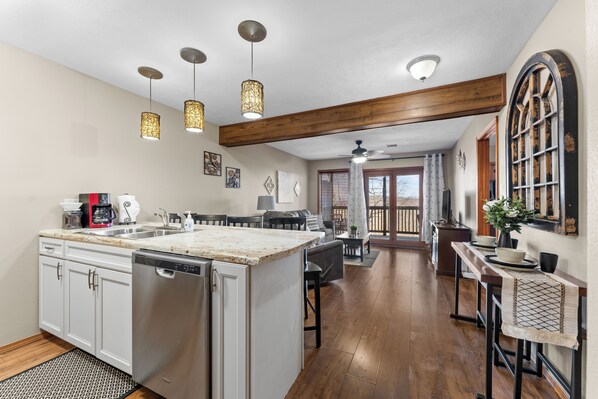 There's no need to leave the comfort of your home-away-from-home to eat during your stay. The fully equipped kitchen has everything you need to prepare delicious meals, or you can use the community charcoal grill to make juicy steaks and burgers.