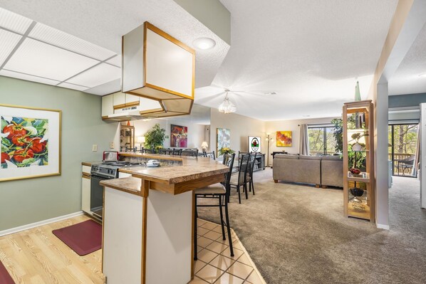 Perfect for a family or group of up to six! The common area includes a full kitchen with major appliances, a dining area with table and bar seating, a cozy living room with cable TV/DVD a sofa bed, and a private, covered balcony. Both bedrooms feature a king-size bed and cable TV, with the master offering balcony access. Enjoy the convenience of an in-unit washer and dryer and free wireless internet with your stay.