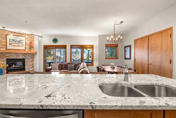 • Fully stocked kitchen with everything needed to cook and serve a meal, kitchen island with additional seating for 4