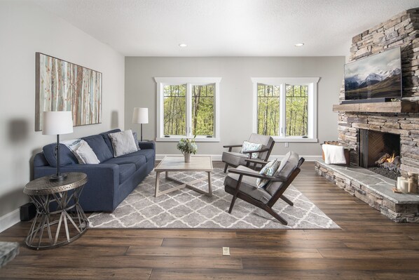 Guests first access Little Bear Lodge through the lower level entrance.  A staircase leads guests to the main level of the home, where they find an open living area with plentiful windows for abundant natural light.  A cozy sofa and additional chairs are situated around the stone fireplace with gas logs.  A modern dining table with seating for 6 provides an indoor gathering place for meal times.  The kitchen is complete with stainless appliances and has been thoughtfully stocked with all the dishes and cookware needed for an enjoyable stay.