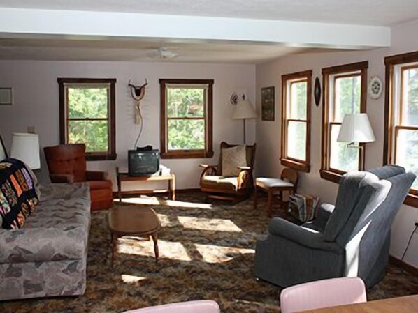 Onze cape-stijl huisje is geschikt voor maximaal tien personen. Er zijn drie slaapkamers, een complete badkamer met bad / douche, en een volledige wandeling uit de kelder met cement patio, luifel en een picknicktafel met uitzicht op Green Pond. Ons huisje heeft een goed uitgeruste kombuis keuken met een volledige fornuis, koelkast, magnetron en andere kleine apparaten. Er is een lichte en luchtige eet- en woonkamer met 180 graden uitzicht op de vijver en het buitenleven. We bieden een kano en roeiboot, een gasgrill om buiten te koken en alles wat u nodig heeft voor uw vakantie, behalve eten, beddengoed en handdoeken.