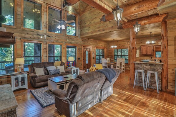 Prepare meals like a pro with top-tier appliances and a well-stocked kitchen, including a waffle bar and coffee station! Start your mornings with a fresh brew or a waffle topped with our provided starter set of mix and toppings—perfect for a slow, relaxing breakfast before the day’s adventures.