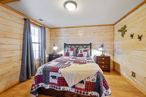 This cozy 900 sq ft 2 bedroom 2 bath cabin with beautiful pine interior sits on the banks of Glover River. It sleeps six with two bedrooms each with a queen bed and a pullout in the living room. It has two ensuite bathrooms. River Rock has a fully equipped kitchen with a dishwasher, washer and dryer, central heat and air, satellite TV, charcoal grill, and patio seating on the large covered back porch. It is an easy walk to the Glover River just off the back deck . Convenient location with all paved roads, just 30 miles north of Hochatown. Also included is a hot tub, DVD player, limited WiFi, and fire pit with firewood provided.