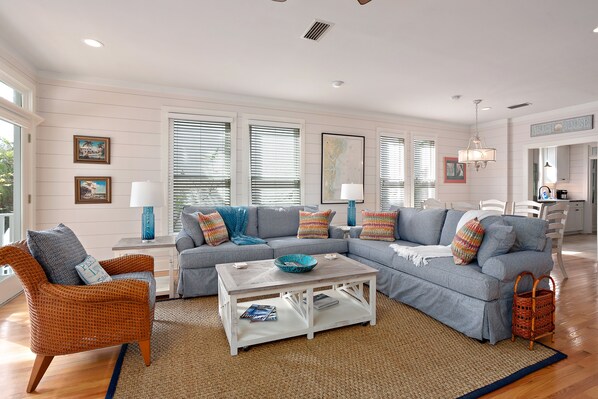 Op de begane grond van het huis kunnen gasten samen genieten van films of de game kijken op de grote 70 "Curved UHD Smart TV in de woonkamer. Een muur van deuren in de woonkamer brengt tonnen licht binnen vanuit de enorme veranda waar gasten kunnen ontspannen en genieten van het uitzicht op de Atlantische Oceaan en kijken naar boten die de St. binnenkomen en verlaten Simons geluid. De keuken is onlangs volledig gerenoveerd met hoogwaardige roestvrijstalen apparaten, een grote boerderijgootsteen en tonnen aanrechtruimte voor gasten om maaltijden te bereiden. Het huis heeft twee eetruimtes met zitplaatsen voor 10 gasten. De woonkamer aan de achterzijde is ook een andere plek om achterover te leunen en te zinken in een van de drie comfortabele stoelen om te genieten van een boek, uw ochtendkoffie te drinken of voor kinderen om te genieten van het spelen van videogames op de 42 "HD-tv. Het huis heeft zelfs een Weber-gasgrill waar gasten kunnen genieten van het grillen van de verse vangst van de dag!