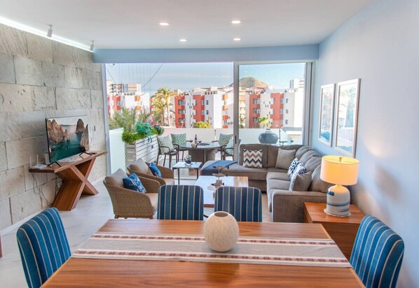 Enjoy the luminous open-concept of the condo, which offers a relaxing living space. The TV/sitting area has comfortable sofa seating for downtime moments at home and a movie on the Smart TV. The floor-to-ceiling, wall-to-wall glass doors offer direct access to the terrace with a fire pit table and chairs. It`s a great spot to enjoy a cocktail or wine as the sun goes down.