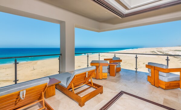 A 2,831 sqft ocean front condo on the Pacific Ocean in one of Cabo´s most exclusive communities. Ocean Club Residences (OCR) 405 is fully equipped, has beautiful travertine floors, panoramic views to the pristine beach, upgraded furnishings and is located within Diamante, offering all amenities. The condo has 2,250 sqft of interior living and another 581 sqft of exterior living. It is located on the very southwest corner of the property and looks to the west. This unit faces away from the pool and the interior of the resort so it is quiet and has completely unobstructed views of the ocean and the undeveloped property and beach to the west. Every night you can see the sun set over the ocean and based on the view, you only see the natural landscape with no buildings in sight. You get the feeling of being alone while still being a part of the resort. The condo is only 200 yards from the ocean. We crack the sliding door at night and fall asleep, and wake up to, the sound of the waves hitting the beach.