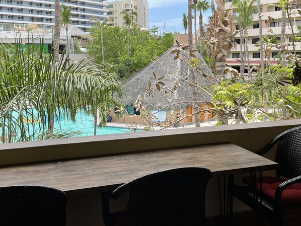 HOLA - Gelegen op de bovenste / 3e verdieping van het "C" -gebouw, dit condominium met 2 slaapkamers en 2 badkamers heeft indrukwekkende gewelfde plafonds en hooggelegen keramische papegaaien die u laten weten dat u op de perfecte plek bent aangekomen om te ontspannen en altijd tot rust te komen zonnige Cabo!