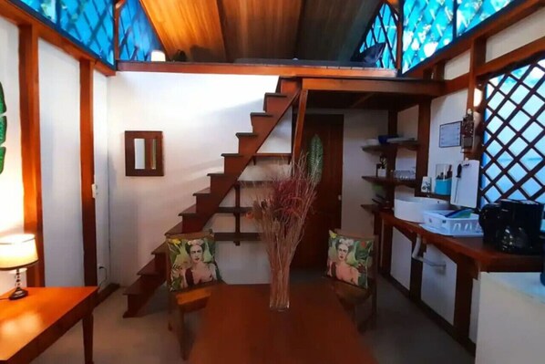 As you step inside, you`ll find a welcoming open space that includes a comfortable brand new supportive mattress for the loft bed tucked into a cozy loft, perfect for a restful night’s sleep.