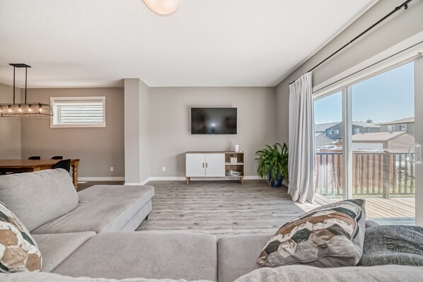 The upstairs bonus room has a large flat screen smart TV and sectional; Perfect to relax and watch Netflix, DisneyPlus or YouTube or telus tv.