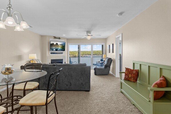 Breng je K-pod's mee, want deze unit heeft een Keurig. Ontbijt bar biedt plaats aan 2, terwijl de eettafel voor 4 personen. Woonkamer heeft veel zitplaatsen, flatscreen-tv, Blu-ray dvd-speler, draadloos internet, elektrische open haard, schuifregelaar naar het dek en een plafondventilator. Ouderslaapkamer met kingsize bed, flatscreen-tv, schuifregelaar naar het dek, plafondventilator en een eigen badkamer met dubbele wastafel. Slaapkamer heeft een Queen size bed, een flatscreen-tv, een plafondventilator en toegang tot de gasten badkamer met staande douche.