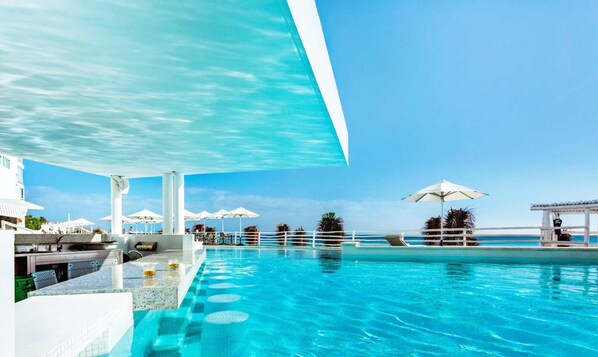 Privéstrand en zwembad met ligstoelen en schaduw.