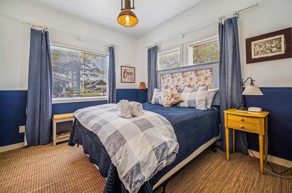 Stairs in the living room take you to the upstairs bedrooms, one with a queen bed, and the second with two twins. The charm of this historic cottage follows you through each room, and you will find these upstairs bedrooms to be so inviting, with classic beadboard and vintage furnishing. The reader in your family will find a hidden treasure in the loft bench, found underneath the windows at the far end. Perfect for hours of reading pleasure (or a well-deserved nap after a day at the beach).