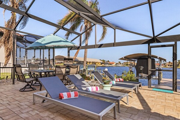 Villa Dock Holiday – Waterfront Luxury Awaits! Experience the ultimate getaway in Cape Coral at this stunning 4-bedroom villa, perfect for families or groups of up to 9 guests. Nestled along a picturesque canal, this single-level home blends modern luxury with a relaxed, inviting atmosphere.