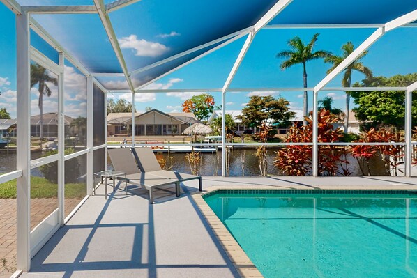 Discover the charm of this stunning canal-front home in Cape Coral, Florida. Situated in a peaceful neighborhood, this house offers not only direct access to the Gulf of Mexico via the Caloosahatchee River but also easy proximity to local shops, restaurants, and attractions. Step outside to your own private oasis featuring a heated, covered pool where you can relax and soak up the Florida sunshine in complete privacy. The spacious patio area is perfect for al fresco dining or simply unwinding with a refreshing drink while taking in the serene water views. Inside, the house boasts a comfortable and inviting atmosphere with modern amenities to ensure a relaxing stay. Enjoy a fully equipped kitchen with top-of-the-line appliances and a cozy living room with a TV for your entertainment. Every detail has been carefully curated for your comfort. With dog-friendly accommodations, this home is perfect for bringing along your furry friend to enjoy the vacation with you. The property also features a king bed, two queen beds, two queen air mattresses, and ample space for the whole family to spread out and feel at home. Explore the surrounding area and discover the beauty of Cape Coral, Fort Myers, and beyond. Whether you're interested in fishing, sailing, or simply lounging by the pool, this waterfront retreat offers endless possibilities for a memorable getaway.