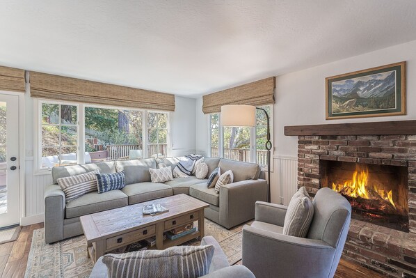 The spacious living room, lined with shelving on one side and windows on the other, is appointed with comfortable furnishings and warmed by a gas fireplace.