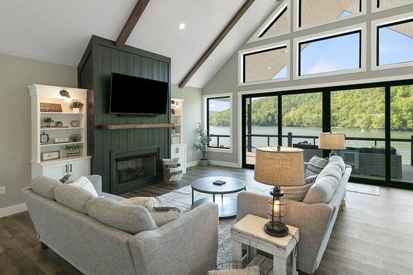 The Living Room hosts a gas fireplace, custom built-ins, large couches, and incredible views of Lake Norris.