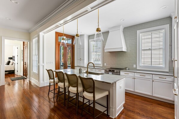 Great for family and friends alike, our property boasts 6 spacious bedrooms with King beds, each accompanied by a full, upscale en suite bathroom and plenty of room for you and your guests to spread out comfortably. Shared spaces are bright and airy – think southern charm with a subtle modern twist!