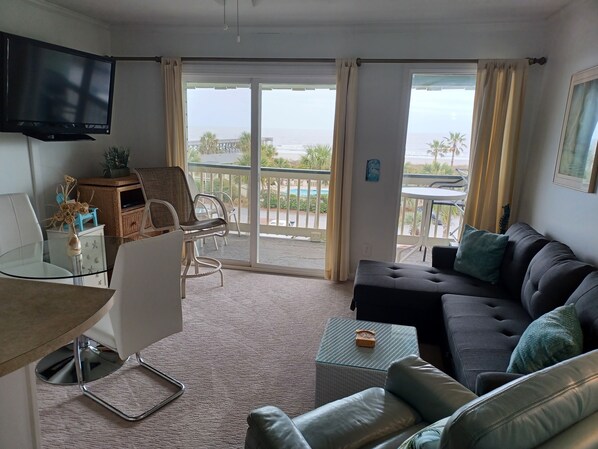 Zoek niet verder! U zult genieten van dit privé, gezellige en superschone condominium met 1 slaapkamer met een volledig uitgeruste keuken en alles wat u nodig hebt om maaltijden te bereiden tijdens uw vakantie. Er zijn twee eetgedeeltes met één aangrenzend aan de keuken en de andere op uw privé balkon met zeezicht! Dit wordt je favoriete plek dag en nacht terwijl je dagdroomt terwijl je naar de oceaan en voorbij varende boten kijkt. Als u liever het strandgebied verkent, kunt u snel lopen naar winkels en restaurants met alles van pizza en hamburgers tot garnalen en grits, vangst van de dag of prime rib!