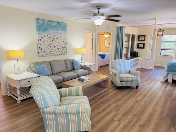 De 2 slaapkamers en de slaapbank in de woonkamer hoek kunnen slapen 6 heartbeats. Slaapkamer heeft een queensize bed; Tweede slaapkamer heeft een volledige, en de slaaphoek off de woonkamer heeft een uittrekbare bank / bed. Keuken en badkamer zijn ruim en hebben nog steeds de retro chic gele werkbladen uit de jaren '70. Dus je zult chillen in een vintage klassieker. En de keuken heeft banket zitplaatsen zodat je gezellig bij elkaar kunt blijven. (Zie het als voedingstherapie). Uw afgesloten garage is een geweldige plek om surfplanken en fietsen veilig op te slaan