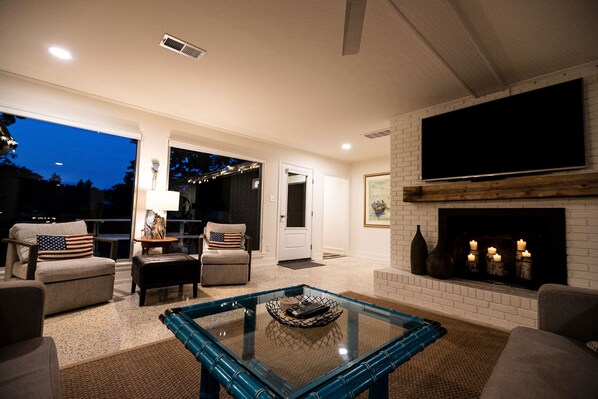 De keuken en grote kamer hebben een open concept, geschikt voor het ontvangen van vrienden en familiebijeenkomsten, met kamerhoge ramen die uitkijken op het meer. De natte bar is een geweldige plek om uw zomervakantie drankjes te mixen.