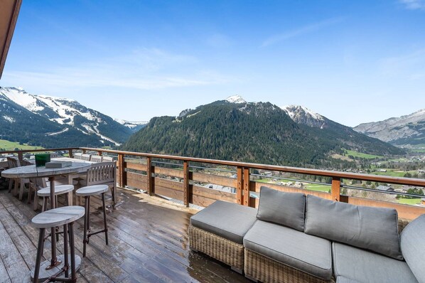Toegang tot het grote terras met tuinmeubilair en uitzicht over de vallei