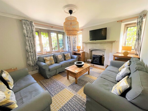 De zitkamer kijkt uit over de rivier de Windrush en beschikt over een antieke stenen open haard (alleen voor decoratief gebruik), samen met designer banken en eikenhouten meubels. Er is ook een tv en een dvd. De slaapkamer op de begane grond biedt ook uitzicht op de rivier en heeft een antieke stenen open haard met elektrisch vuur, twee eenpersoonsbedden en antieke meubels.