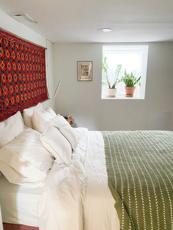 Adjacent to the kitchen is a cozy Queen bedroom with new bedding, pillows a closet and small dresser.