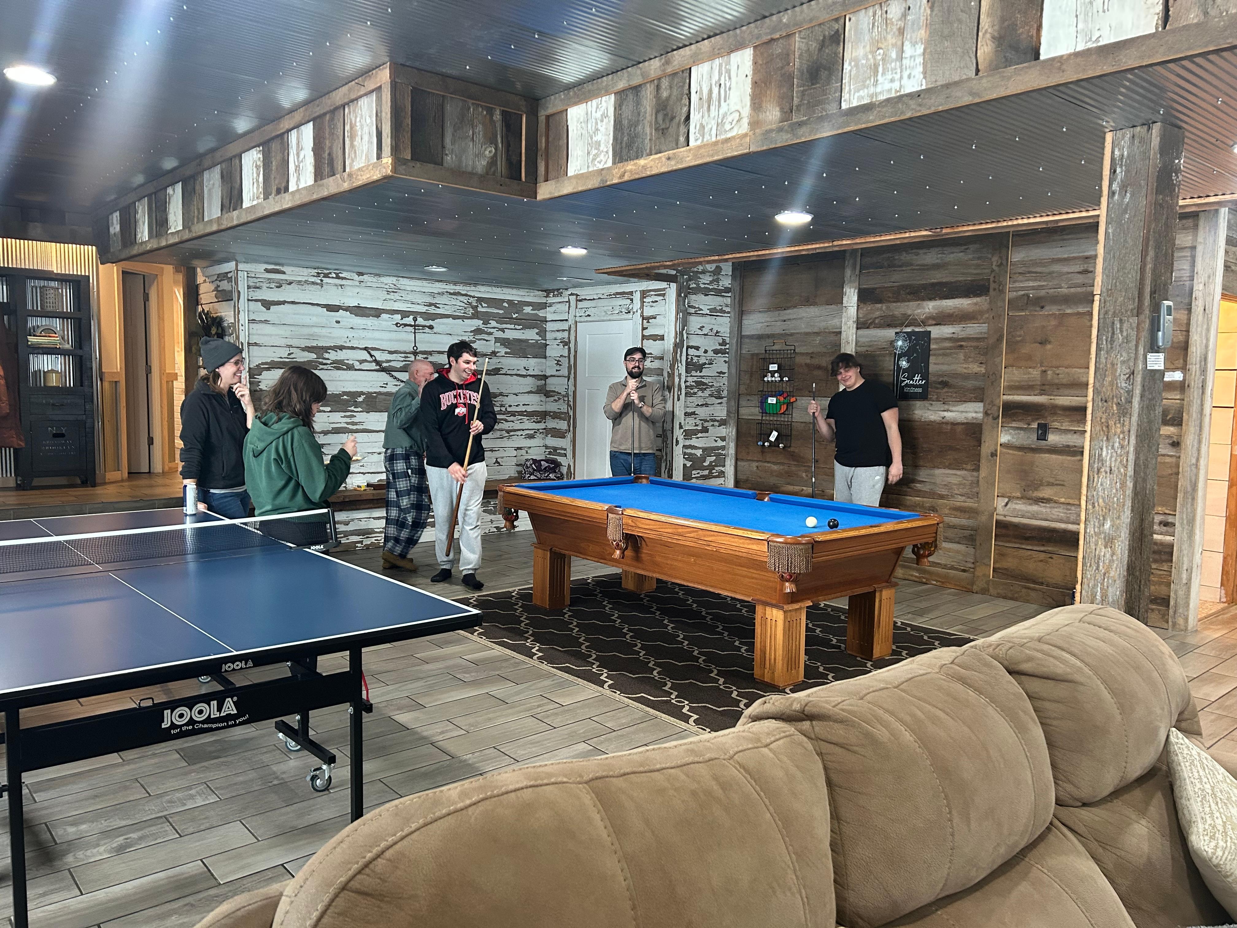 Karshner Place. Nieuwe aanbieding in de zomer van 2016 voor Country Lane Lodging. Deze ruime vakantie lodge ligt dicht bij de Old Mans Cave-attracties in de schilderachtige Hocking Hills. Het ligt ook dicht bij het stadje Laurelville, dat restaurants, een tankstation, een ijssalon, een supermarkt, een winkel met huurfilms en een bank heeft. De Karshner Place is geschikt voor maximaal 22 personen. Het beschikt over een grote woonkamer met een smart-tv en een Samsung dvd-speler (met apps). (TV is alleen internet-tv en alleen lokale kanalen die u soms kunt ophalen, geen kabel of satelliet, breng uw eigen streaming-apparaten en uw eigen internet tv-abonnementen) De woonkamer heeft ook een elektrische open haard die verwarmt. Het heeft een grote eetkamer met veel zithoek. Het heeft in totaal 7 slaapkamers en 4 badkamers. Het heeft een volledig uitgeruste keuken. Slaapkamer # 1 bevindt zich op de open zolderruimte boven de eetkamer met een queensize bed en een uitklapbare koningin. De open loft boven de woonkamer heeft een dubbele uittrekbare en 1 chaise longue. Slaapkamer # 2 is een gesloten slaapkamer op de zolderverdieping met een queensize bed en een queensize slaapbank en een klein balkon. Komende van de zoldertrap, rechtdoor is Badkamer # 1 met een douche en een grote jacuzzi. Slaapkamer # 3 bevindt zich op de begane grond en heeft een queensize bed en een ligstoel. Deze slaapkamer heeft een deur naar de grote badkamer # 1. Slaapkamer # 4 bevindt zich op de begane grond en heeft een queensize bed. Slaapkamer # 5 bevindt zich op de begane grond en heeft een queensize bed. Badkamer # 2 is net buiten de slaapkamers # 4 en 5, met een bad / douche. Slaapkamer # 6 bevindt zich op de benedenverdieping en heeft een queensize bed. Deze slaapkamer heeft een deur naar Badkamer # 3 met een bad / douche. Slaapkamer # 7 bevindt zich op de benedenverdieping en heeft een queensize bed. Deze slaapkamer heeft een deur naar Badkamer # 4 met een bad / douche. Er is ook een volledige slaapbank op het lagere niveau in het recreatiekamergedeelte. Handdoeken en beddengoed worden verstrekt. Het beschikt ook over een grote Rec Room met een pooltafel, tafeltennistafel en een Smart TV en een Samsung dvd-speler (met apps) op het lagere niveau. Buiten het beschikt over een wrap around dek, een kleine veranda en een klein terras aan de achterkant van de lodge met een gas grill. Aan de zijkant van de lodge is een groot terras met een vuurring met een verwijderbare grill om te grillen (je kunt grillen met brandhout, dat ze verkopen in Laurelville bij Young's Market en Ridge Inn). We hebben een bubbelbad voor 8 personen toegevoegd in 2018, net buiten de Rec Room. Wekelijkse tarieven geven u een gratis doordeweekse avond.
